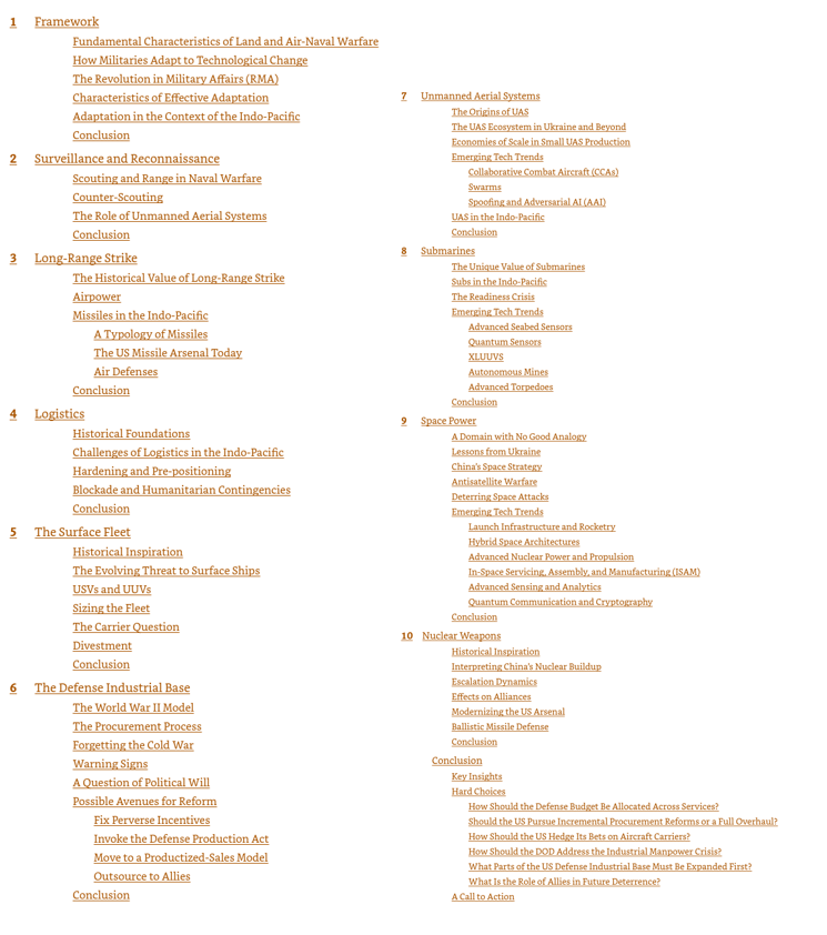 - Domain-Specific Recommendations: The text examines essential areas of military power, including undersea warfare, naval fleets, munitions and drones (emphasizing mass production of attritable systems), logistics networks, the defense industrial base (requiring reform and allied collaboration), and space/nuclear domains (where emerging technologies are reshaping strategic balances).