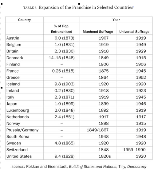 This is about the reasons for democracy’s expansion around the world. Author seems to be connecting it to division of labor, expansion of market, and individualization of population that participates in it. Consequently it led to expansion of political participation in the struggle over control of the state, which at the long run defines resource allocations and transfer. Here is graphic representation of these ideas: