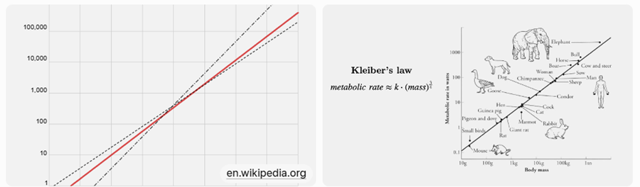 West builds on Kleiber’s law, which states that an animal’s metabolic rate scales sublinearly with body mass to the approximately 3/4 power (β ≈ 0.75). Doubling an animal’s mass requires only about 75% more energy, not 100%, yielding economies of scale. This sublinear pattern extends to other traits: larger animals exhibit slower heart rates, longer lifespans, and a decelerated pace of life, while growth follows a sigmoid curve—rapid initial expansion followed by a plateau and eventual death.
