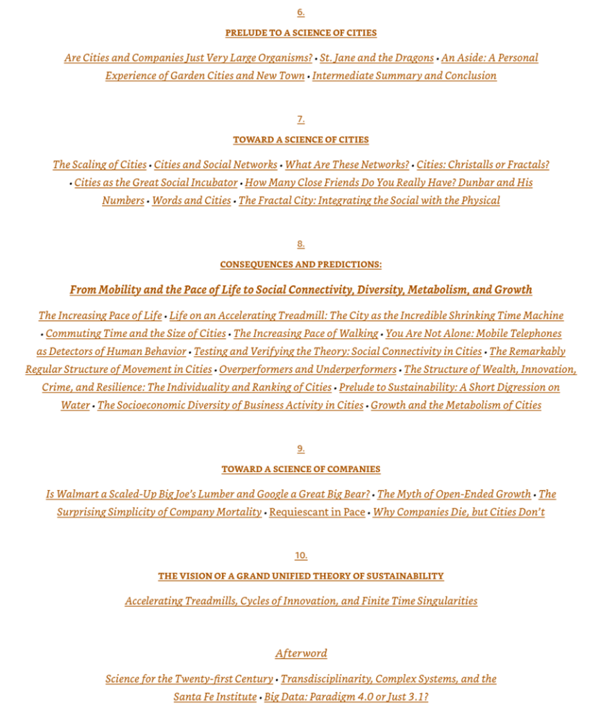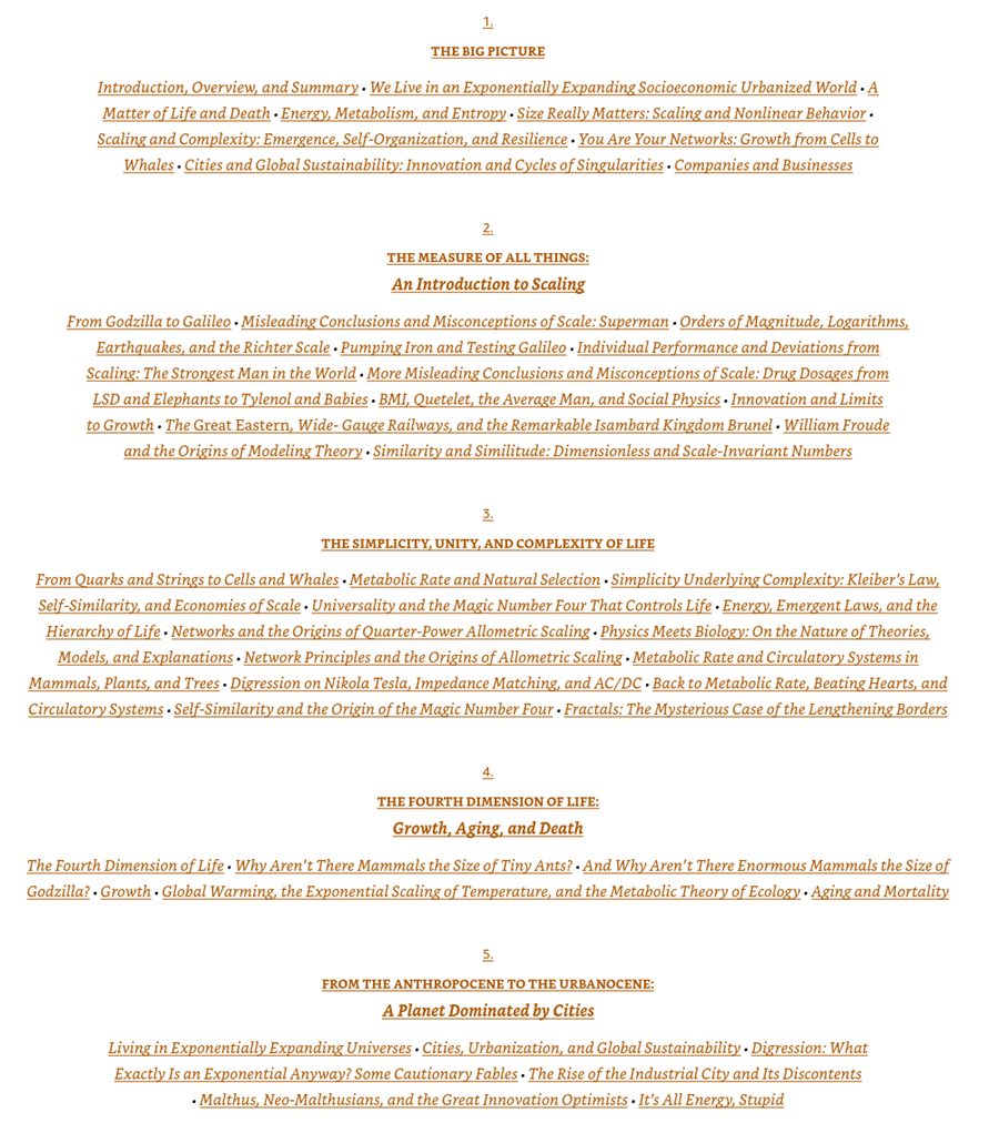 This book presents an unusual point of view that links the scale, growth, and complexity of different systems. The comparison among biological, societal, and business systems is particularly interesting, especially the author’s use of β and the distinction between sublinear and superlinear scaling across these systems, and his attempt to link them into a unified theory of sustainability.